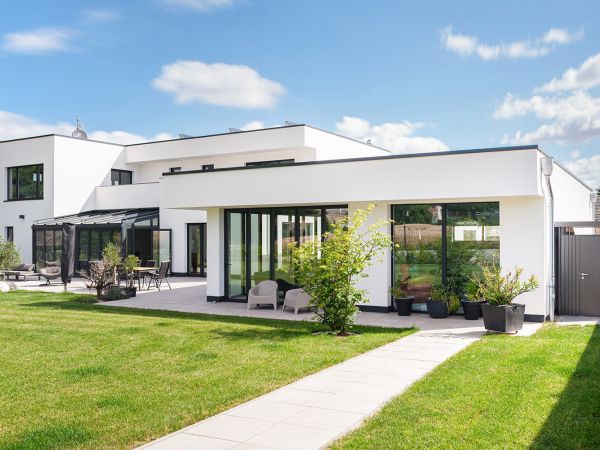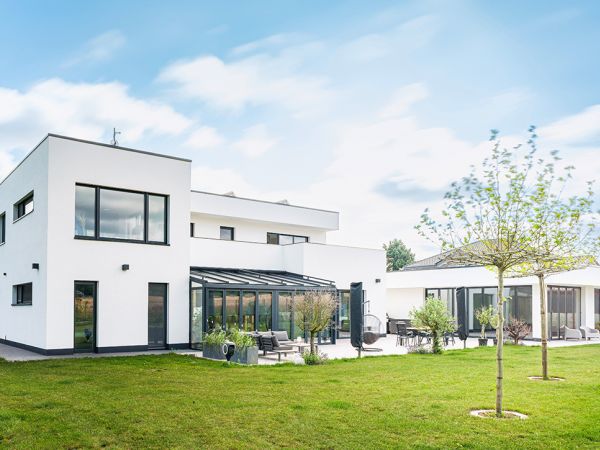Unsere Gestaltung beschäftigt sich mit einem zeitgemäßen Energiekonzept und ökologischer Nachhaltigkeit, die sich geradlinig in die Umgebung einfügt. Der Wintergarten lädt dazu ein, die Jahreszeiten unmittelbar zu erleben, während das Poolhaus eine zusätzliche Dimension des Komforts bietet.