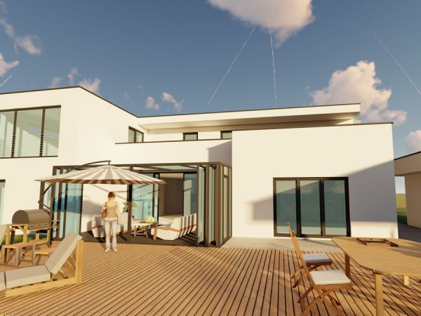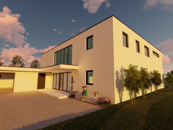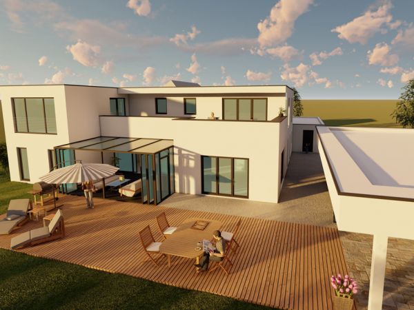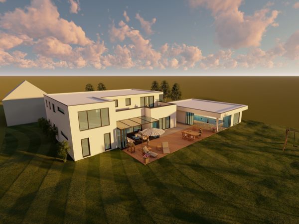 Von der Visualisierung zur Realität: Ein gehobenes Wohnhaus im ländlichen Ambiente, das für eine harmonische Verbindung von modernem Design und fortschrittlicher Energieeffizienz steht.
